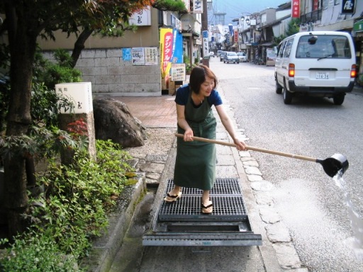 いまはところどころの蓋を開けて長い柄のひしゃくで水を汲むのですが、これがなかなか力の要る作業で、「蓋の無かったときの方が汲みやすかったなー」「こんなきれいな流れを蓋をなくして観光客の皆さんに見せたいな。もっと水の町がアピールできるのに。」